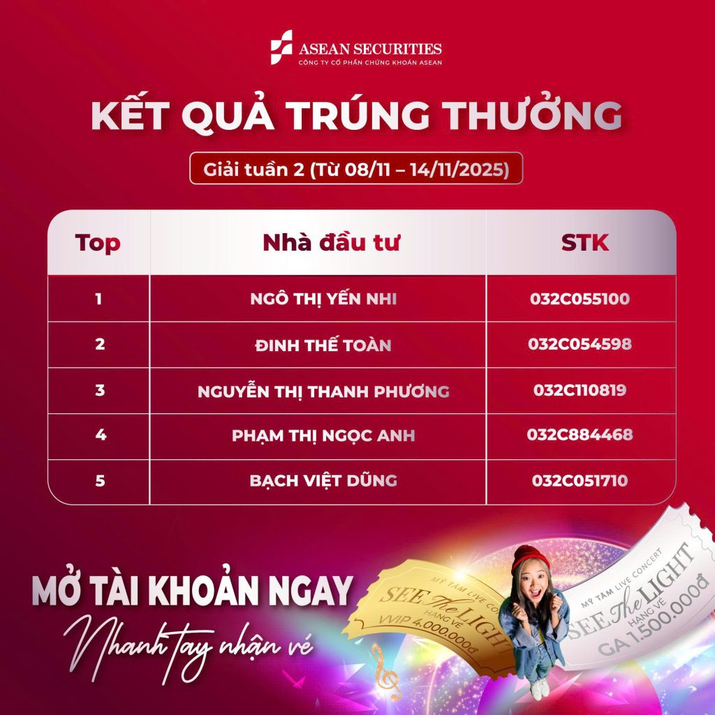 ASEAN Securities xin chúc mừng TOP 5 khách hàng đã trúng thưởng Tuần 2 (08/11 – 14/11/2025) chính thức nhận về 5 vé GA trị giá 1.500.000 đồng/vé.