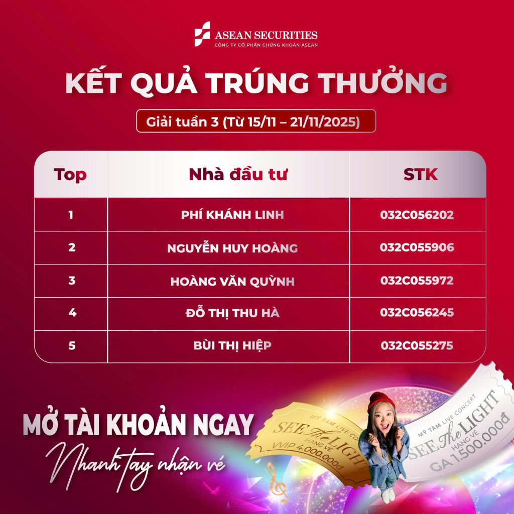 ASEAN Securities xin chúc mừng TOP 5 khách hàng đã trúng thưởng Tuần 3 (15/11 – 21/11/2025) chính thức nhận về 5 vé GA trị giá 1.500.000 đồng/vé.