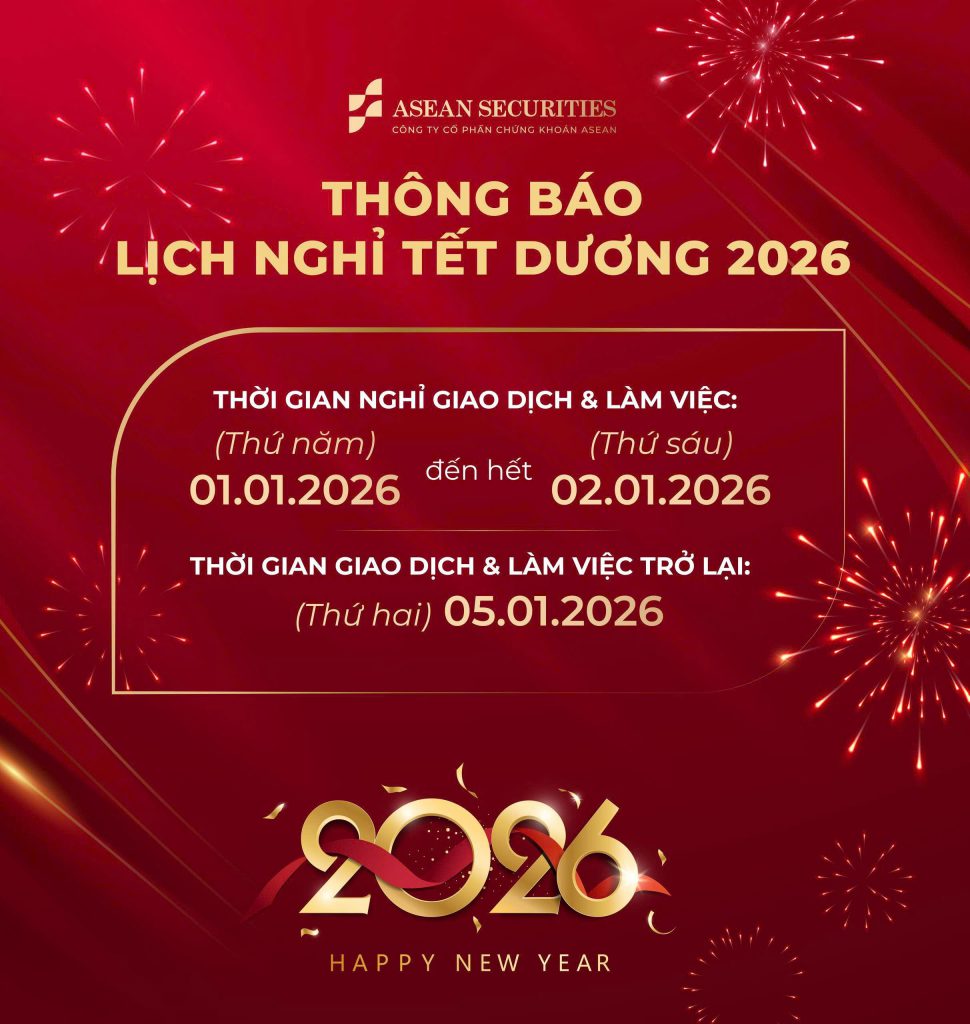 ASEAN Securities chân thành cảm ơn Quý khách đã tin tưởng và đồng hành cùng chúng tôi thời gian qua. Năm mới 2026, ASEAN Securities kính chúc Quý khách Sức khỏe – Hạnh phúc – Đầu tư hiệu quả và nhiều thành công mới.